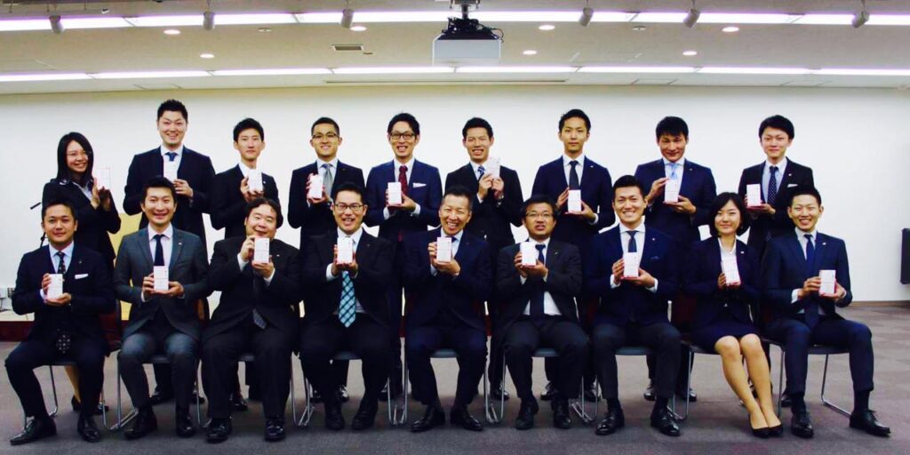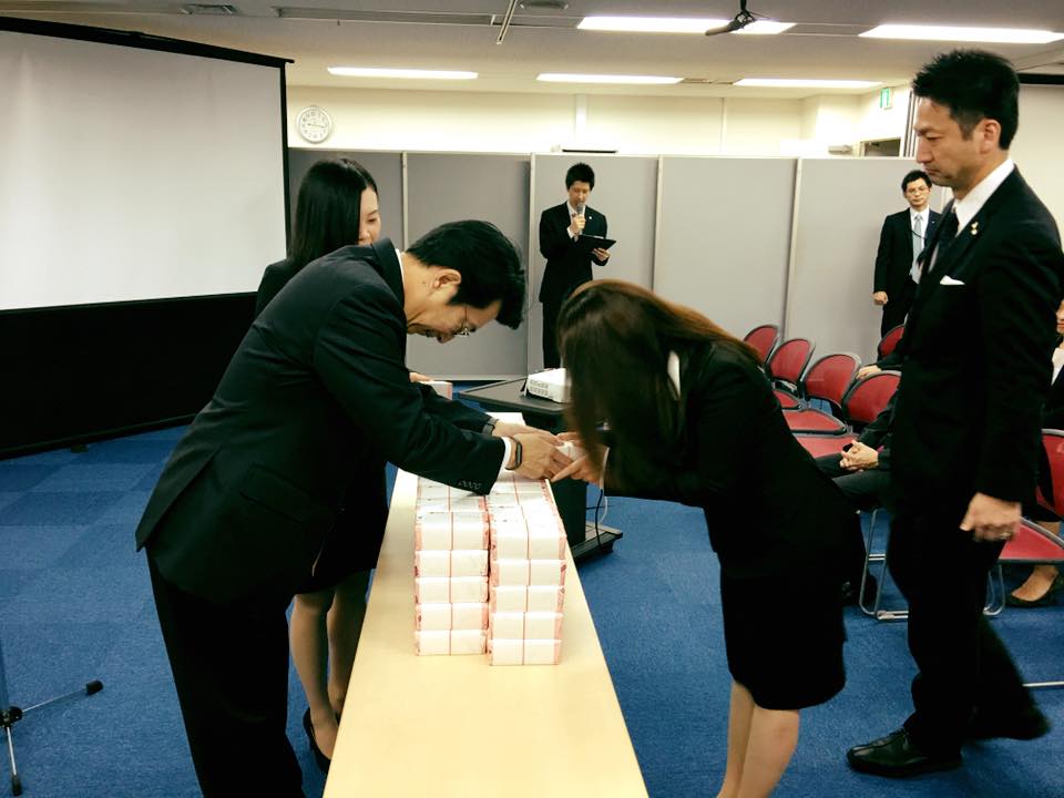 式典の後恒例の紅白饅頭を、社員一人ひとりに感謝の気持ちと心を込めて、